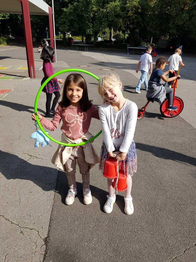 In einer gemeinsamen Bewegungs- und Spielestunde auf dem Schulhof hatten die Patenkinder die Gelegenheit, sich noch näher kennenzulernen. Die Kinder hatten sichtlich Spaß und bauten erste Freundschaften auf.