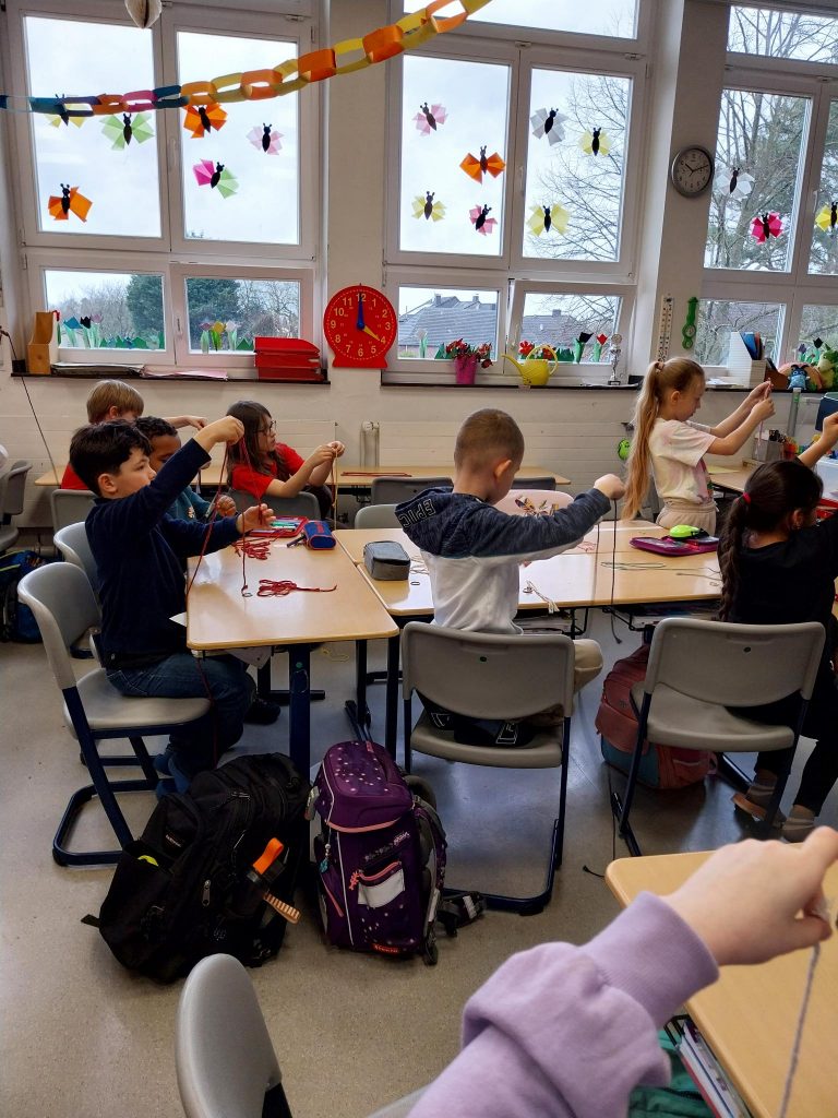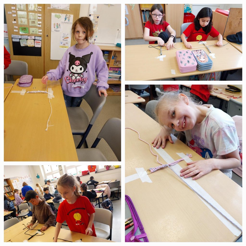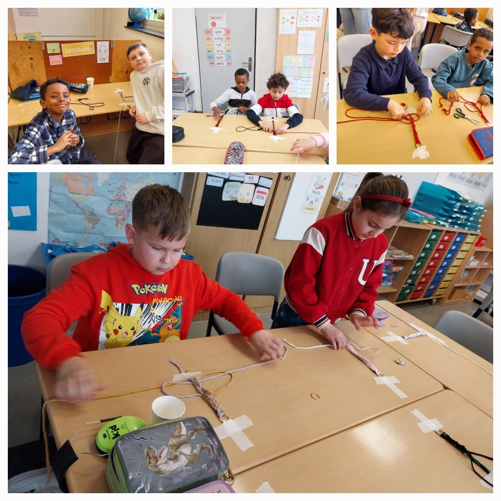 Anbei ein paar Fotos von der Kulturstrolche-Aktion der Klasse 3a. Es war ein richtig toller Tag mit vielen schönen Momenten – wir haben Schlüsselanhänger mit Makramee-Technik geflochten, dabei viel Neues gelernt und kreativ gearbeitet. Alle waren fertig mit dem Basteln und haben den Anhänger sofort an den Taschen gehängt! Wir bedanken uns bei Frau Petra Marín von der Farbenwerft in Dülken und sagen Auf Wiedersehen.