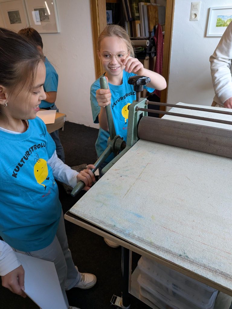 Kurz vor den Osterferien erlebten die Kinder des vierten Schuljahres einen ganz besonderen Ausflug im Rahmen des Projekts „Kulturstrolche“. Ziel war das Atelier von Dagmar Reichel, wo die Schülerinnen und Schüler in die Welt der Druckkunst eintauchen durften.