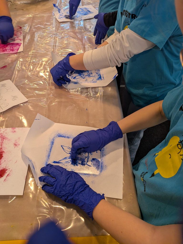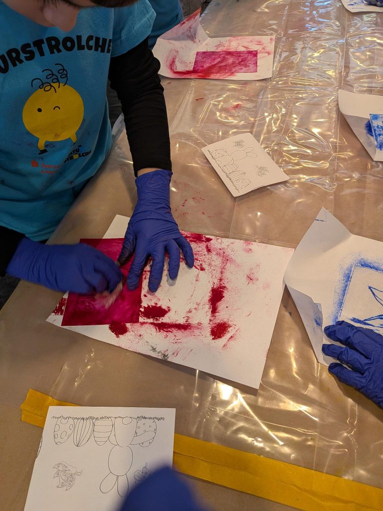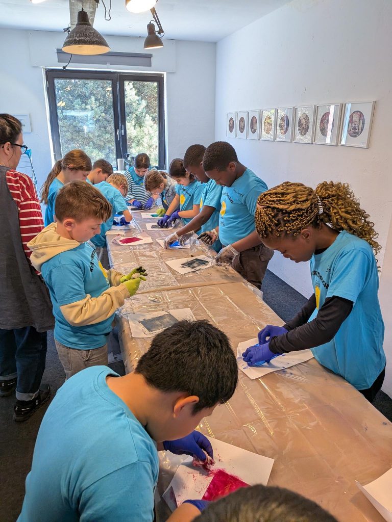 Mit viel Neugier und Begeisterung probierten die Kinder eine spannende Drucktechnik aus. Zunächst kratzten sie eigene Muster und Motive in vorbereitete Platten. Diese wurden anschließend mit Farbe bestrichen. Mit Hilfe von Druckwalzen übertrugen die Kinder ihre gestalteten Vorlagen auf Papier – und staunten nicht schlecht über die tollen Ergebnisse.