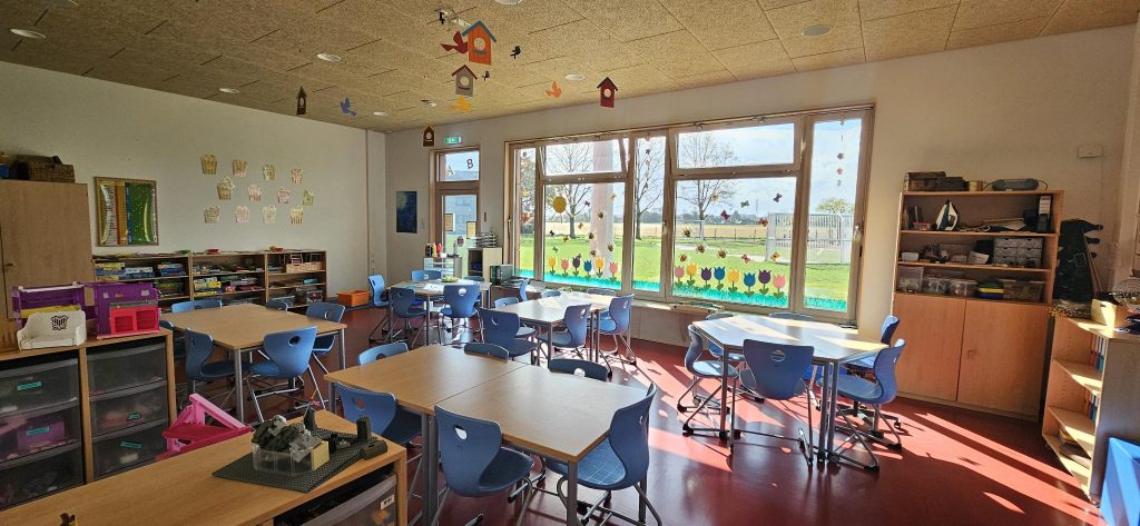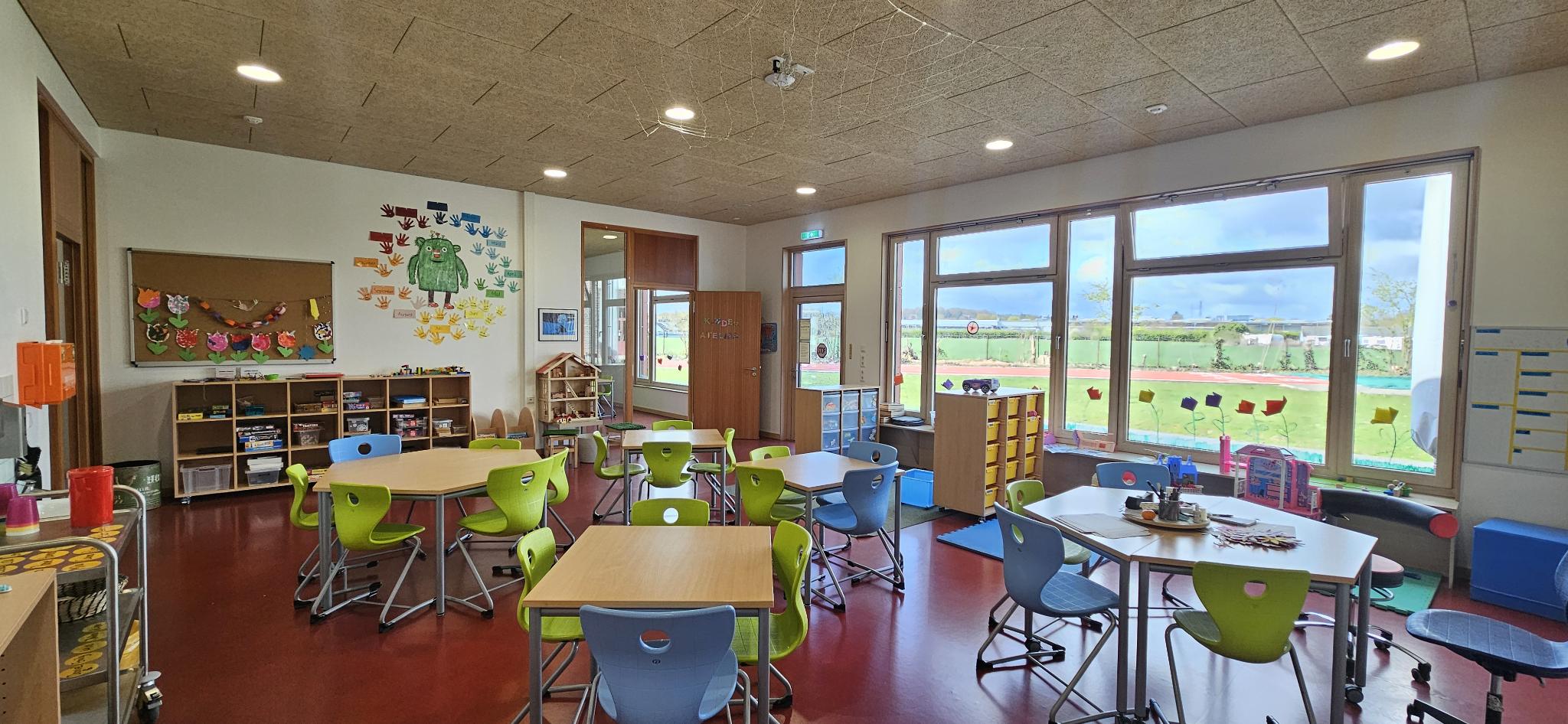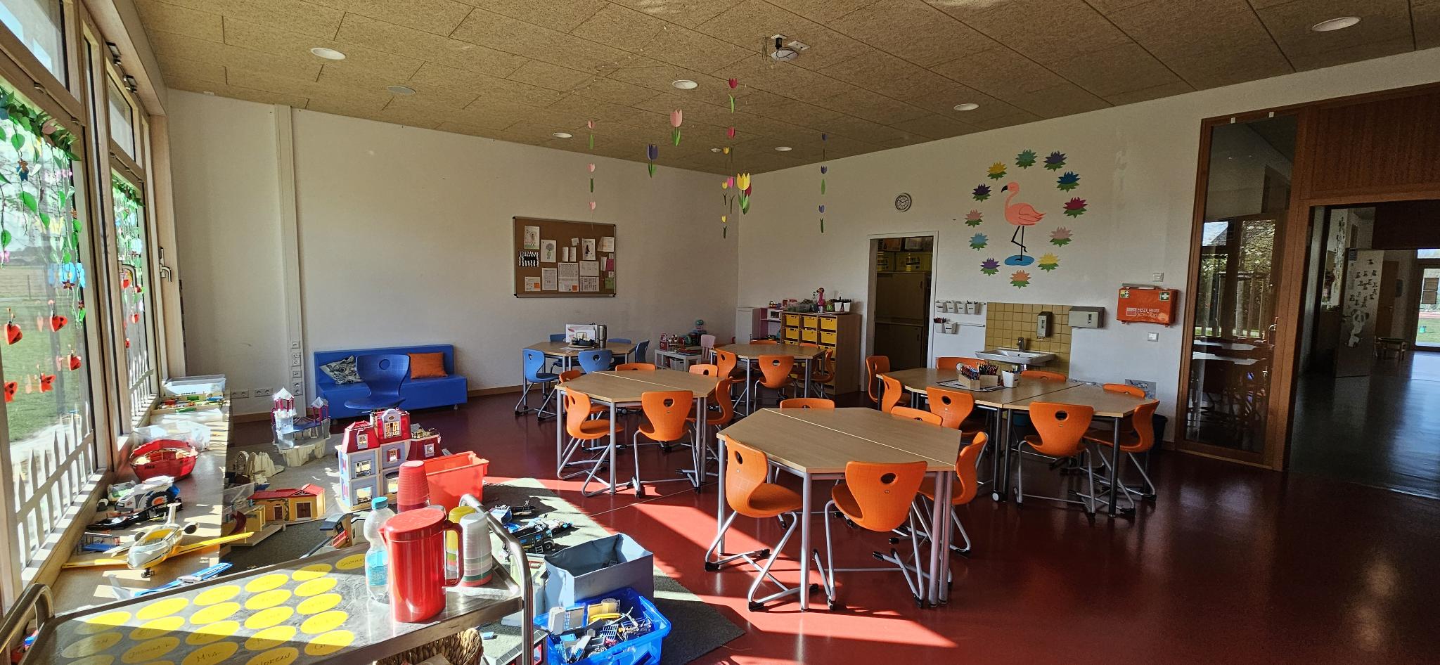 - Räumlichkeiten: Im Hauptgebäude sind drei Gruppen, ein großer Speisesaal, das Büro/ der Personalraum und Toiletten. Zudem haben wir ein großes Außengelände. Die vierte Gruppe ist im Schulgebäude integriert. Durch die steigende Nachfrage nach einem Betreuungsplatz wird ab Sommer 2026 die fünfte Gruppe geplant. Aktuell werden in 4 Gruppen 121 Kinder betreut.