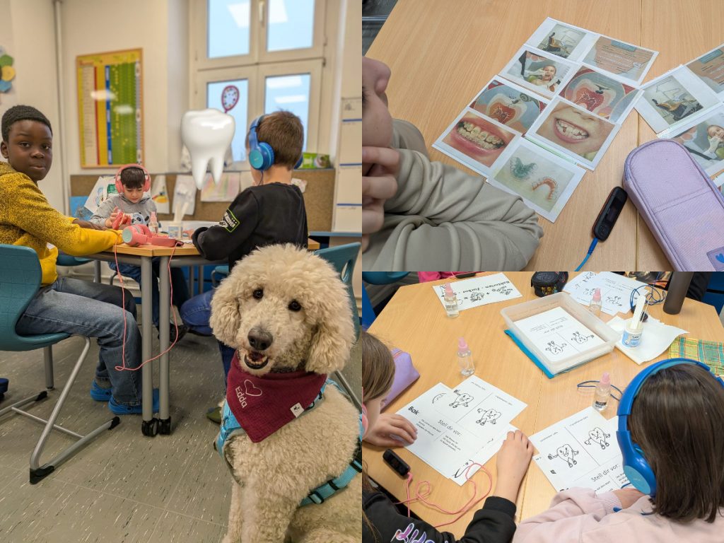 Ein besonderes Highlight war der Vergleich zwischen dem menschlichen Gebiss und dem Hundegebiss. Gemeinsam mit dem Schulhund Edda, einem Pudel, wurde das Hundegebiss genau betrachtet. Die Kinder erfuhren, dass Pudel genetisch zu Zahnproblemen neigen und deshalb ebenfalls regelmäßige Zahnpflege benötigen. Dieser Vergleich sorgte für großes Interesse und half den Kindern, Gemeinsamkeiten und Unterschiede zwischen Mensch und Tier besser zu verstehen.
